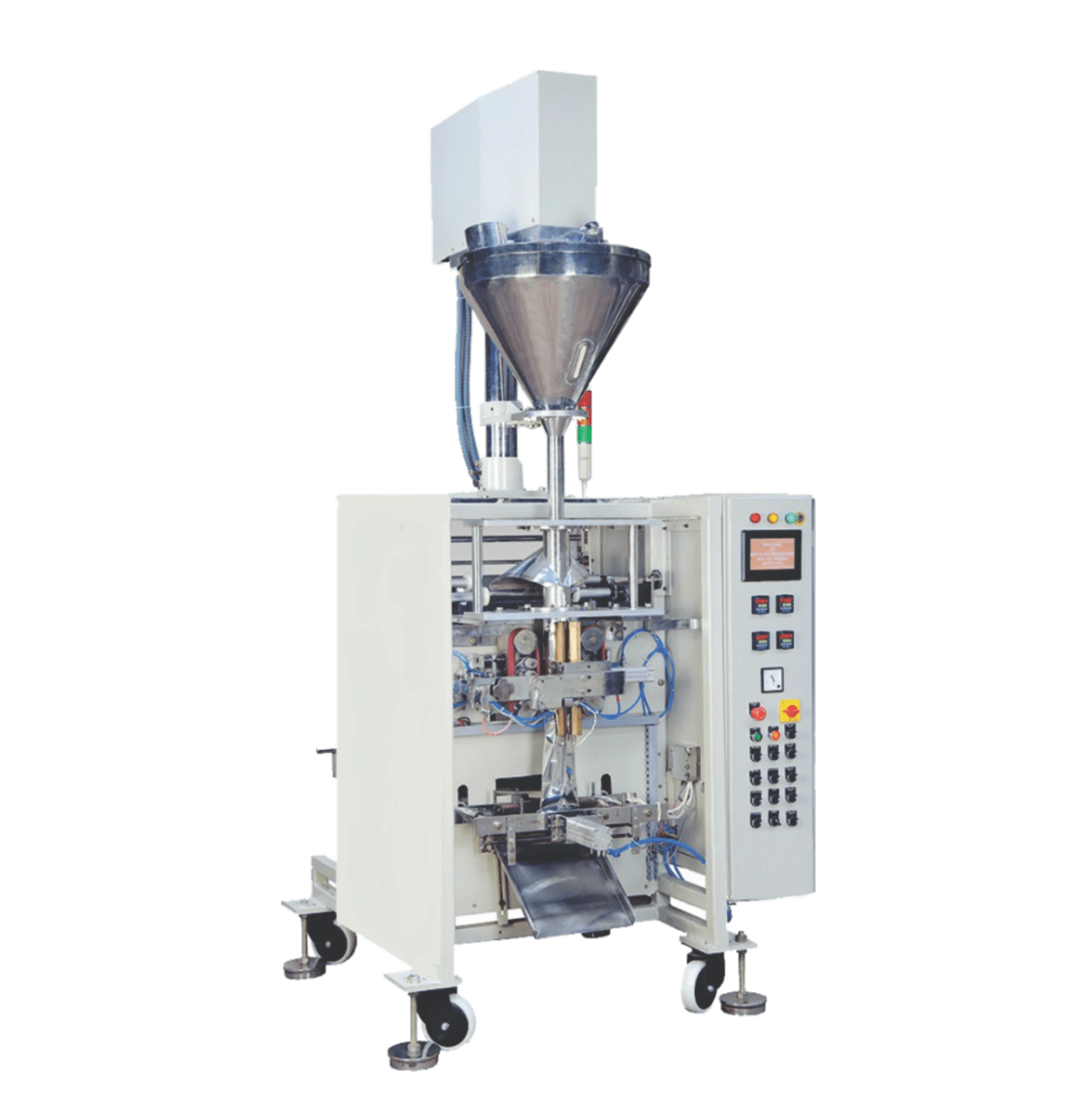 JAT-307 can generate 20 to 60 packets per minute employing Auger filler system. It is fabricated with heat sealable laminated film with a maximum width of 700 millimeters. It uses Clutch-Brake film draw mechanism for controlling the packaging process. The machinery is made up of high-quality materials, latest technology with versatile functionality. The primary objective of the machine is to maintain the safety of the product while packing them in the pouches of different weights. Weighing 1200 kilograms, the Sattu packing machine is fully automatic and runs on the quick controlled AC drive.